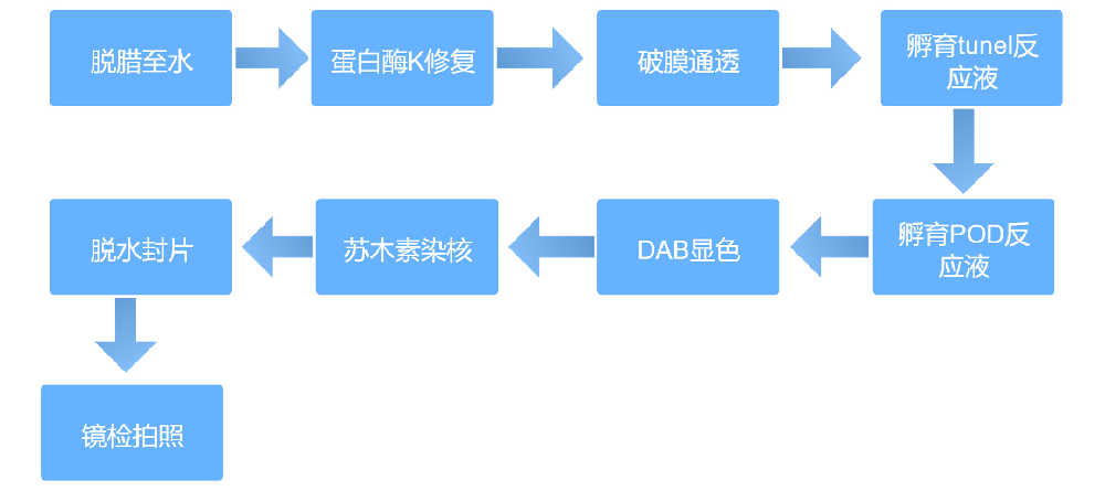 晚期凋亡细胞中染色体DNA双链或单链断裂产生粘性3'-OH末端,在脱氧核糖核苷酸末端转移酶(TdT)的催化下,将带有生物素(Biotin)分子的dUTP,标记到DNA的3'-末端,随后和辣根过氧化物酶(HRP)标记的链酶亲和素Streptavidin(Streptavidin-HRP)结合,最后通过DAB显色来显示凋亡细胞,从而可以通过普通光学显微镜检测到凋亡的细胞,这就是Tunel(TdT-mediateddUTPNick-EndLabeling)法检测细胞凋亡的原理。
